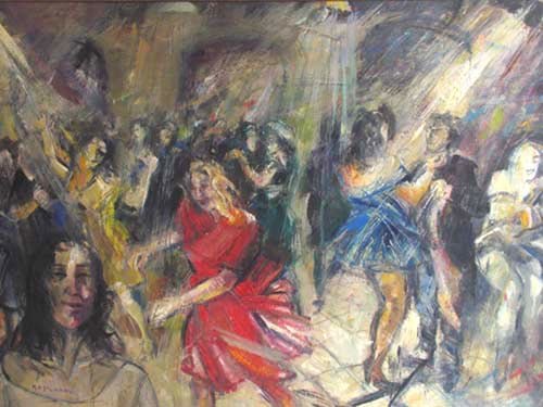 La tela vibra di energia e movimento, catturando l’atmosfera elettrica di una balera, luogo popolare dove musica, corpi e luci si intrecciano in un’unica danza collettiva.