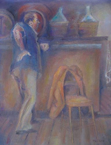Il banco, con le botti e le damigiane, richiama l’ambiente familiare di un’osteria o di una cantina, luogo di incontri e memorie. I toni caldi del marrone e dell’ocra, insieme alle sfumature bluastre della figura, creano un equilibrio tra realtà e sogno, tra concretezza e malinconia.