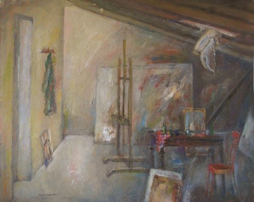 “Interno di studio” (2008) è una tela che trasmette l’anima più intima dell’artista: il suo luogo di lavoro, il suo rifugio creativo, lo spazio dove la quotidianità si intreccia con il silenzio della pittura.
